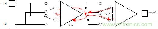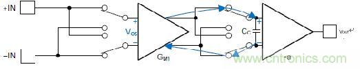 斬波零漂移放大器的內(nèi)部結(jié)構(gòu)可以具有與連續(xù)時間放大器一樣多的級數(shù)——主要區(qū)別在于第一級的輸入和輸出具有一組開關(guān),用于在每個校準(zhǔn)周期內(nèi)反轉(zhuǎn)輸入信號。圖3顯示了前半個周期。在前半周期,兩組開關(guān)都配置為翻轉(zhuǎn)輸入信號兩次,但失調(diào)翻轉(zhuǎn)一次。這使輸入信號保持同相,但失調(diào)誤差極性相反。