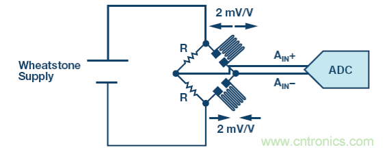 應(yīng)變計(jì)的靈敏度通常為 2 mV/V。惠斯登電源越高,靈敏度也就越高。為了增加應(yīng)變計(jì)的動(dòng)態(tài)范圍并最大化 SNR,電橋可能采用比 ADC 更高的電源供電。