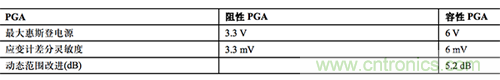 表 1. 惠斯登電橋中的阻性 PGA 和容性 PGA 對(duì)比(假設(shè)使用標(biāo)準(zhǔn)電源和增益)