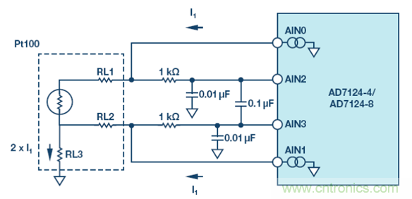 測(cè)量溫度并消除引線誤差的傳統(tǒng)方法如圖 10 所示。本例中,集成 PGA 的 Σ-Δ 型 ADC AD7124-8 的內(nèi)部電流源以相同電流驅(qū)動(dòng)雙線式 RTD,在兩個(gè)引線上產(chǎn)生相同的失調(diào)誤差,其值與引線電阻成正比。