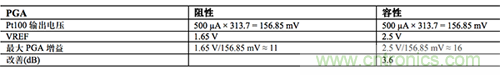 表 2 總結(jié)了阻性 PGA 相對(duì)于容性 PGA 的最大增益,最大電流源為 500 µA,限制了 Pt100 的自發(fā)熱(假定 B 類 RTD,此時(shí)最高溫度為 600°C,最大 VREF 為 2.5 V)。