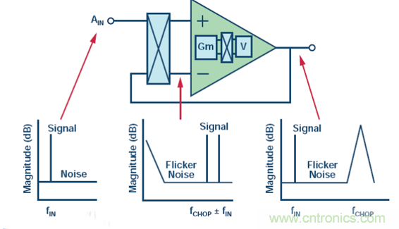 對(duì)輸入進(jìn)行斬波之后,輸入頻率便調(diào)制到較高頻率。緩沖器失調(diào)和閃爍噪聲依然保持其最初的低頻率,因?yàn)樗鼈儾皇茌斎霐夭ǖ挠绊憽?/div>