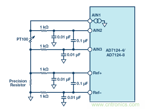使容性 PGA 性能與阻性 PGA 相當(dāng)?shù)目尚修k法是以更高的電源電壓對(duì)電橋供電。比如,以±3.3 V 雙極性電源對(duì)電橋供電,從而增加應(yīng)變計(jì)的靈敏度,但代價(jià)是更高的系統(tǒng)復(fù)雜性和功耗??赡軙?huì)得益于容性 PGA 的另一個(gè)例子是采用電阻式溫度檢測(cè)器(RTD)或熱電偶的溫度測(cè)量應(yīng)用。常用 RTD 電阻(比如 PT100)可以用來直接檢測(cè)溫度,或間接檢測(cè)熱電偶的冷結(jié),如圖 9 所示。