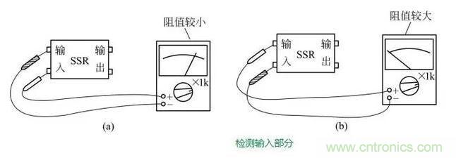 檢測固態(tài)繼電器時(shí),將萬用表置于“Rx1K”檔,分別檢測其輸入部分和輸出部分。
