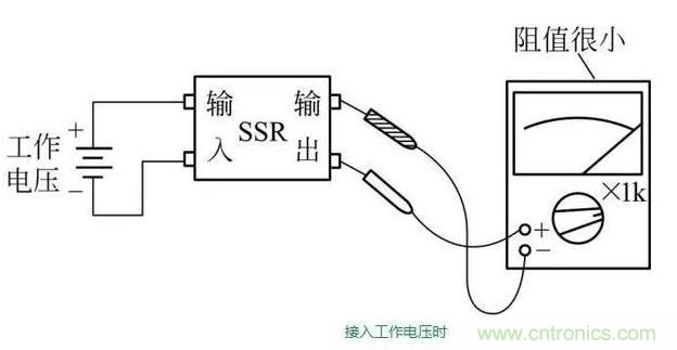 在上一步檢測的基礎(chǔ)上,給固態(tài)繼電器輸入端接入規(guī)定的工作電壓,這時(shí)固態(tài)繼電器輸出端兩引腳之間應(yīng)該導(dǎo)通,萬用表表針指示阻值很小。
