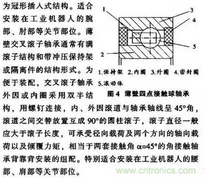 球軸承是機(jī)器人和機(jī)械手機(jī)構(gòu)中最常用的軸承。它能承受徑向和軸向載荷,摩擦較小。其機(jī)器人專(zhuān)用軸承四點(diǎn)接觸式設(shè)計(jì)以及高精度加工。這種軸承比同等軸徑的常規(guī)中系列四點(diǎn)接觸軸承輕25倍。它的內(nèi)圈(或外圈)由兩個(gè)半圈精確拼配而成,而其整體外圍(或內(nèi)圈) 的溝曲率半徑較小,使鋼球與內(nèi)、外圈在四個(gè)“點(diǎn)”上接觸。既加大了徑向負(fù)荷能力,又能以緊湊的尺寸承受很的兩個(gè)方向的軸向負(fù)荷,并且有很好的兩個(gè)方向的軸向限位能力,因?yàn)樗妮S向游隙相對(duì)較小。而其接觸角 (一般取為35)又較大。工業(yè)機(jī)器人專(zhuān)用薄壁四點(diǎn)接觸球軸承通常有帶密封圈和不帶密封圈的結(jié)構(gòu)形式(見(jiàn)圖4)。其主要由內(nèi)圈、外 圍、保持架、鋼球或非接觸式密封圈組成。內(nèi)、外圈均為整體結(jié)構(gòu)。鋼球與內(nèi)、外因溝道呈四點(diǎn)接觸.保持架為冠形插入式結(jié)構(gòu)。