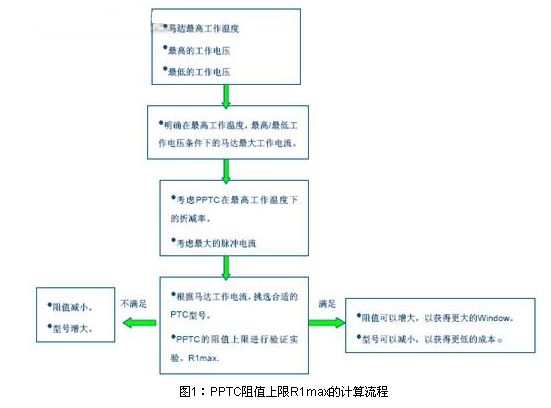 首先要確認(rèn)PPTC的阻值上限R1max。下圖1為PPTC阻值上限R1max的設(shè)計(jì)流程。