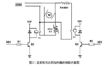 下圖3為多功能豆?jié){機(jī)馬達(dá)和加熱器的簡(jiǎn)單電路示意圖。豆?jié){機(jī)所用馬達(dá)為220V直流馬達(dá),繼電器的工作電壓為12V,豆?jié){機(jī)利用繼電器把MCU發(fā)出的低壓控制信號(hào)I/O來(lái)控制交流高壓信號(hào)的通斷,R3為PPTC可恢復(fù)電阻,T1和T2為繼電器。