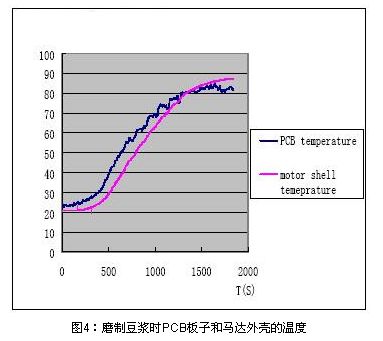 用上文所述的PPTC設(shè)計(jì)流程可以用在多功能豆?jié){機(jī)馬達(dá)防堵保護(hù)設(shè)計(jì)中,但這是往往會(huì)碰到選擇PPTC型號(hào)困難的問(wèn)題,也就是說(shuō)多功能豆?jié){機(jī)的馬達(dá)保護(hù)設(shè)計(jì)會(huì)較普通的小家電馬達(dá)保護(hù)復(fù)雜的多,圖4為磨制豆?jié){時(shí)PCB板周圍環(huán)境溫度和馬達(dá)外殼溫度的實(shí)測(cè)圖,可見(jiàn)控制電路PCB板PPTC周圍的環(huán)境溫度最高可以到達(dá)85C。由于豆?jié){機(jī)的PPTC最高環(huán)境溫度85度會(huì)比普通的小家電最高環(huán)境溫度要求高,這樣既要在85度的最大工作電流下能正常工作,還要保證在最低溫度0度的堵轉(zhuǎn)電流情況下能及時(shí)的保護(hù),相應(yīng)的就增大了設(shè)計(jì)難度。下面就具體的闡述此類多功能豆?jié){機(jī)馬達(dá)堵轉(zhuǎn)的保護(hù)設(shè)計(jì)方案。