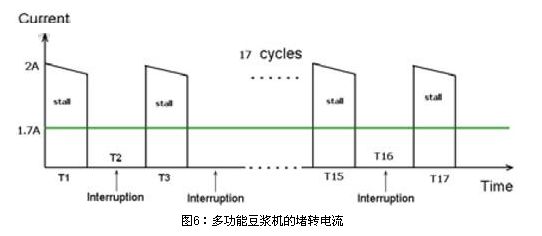 圖6為多功能豆?jié){機(jī)的堵轉(zhuǎn)電流。在榨水果的堵轉(zhuǎn)情況下,實(shí)測(cè)馬達(dá)的堵轉(zhuǎn)最大電流為2A,由于榨果汁時(shí)馬達(dá)也不是一直連續(xù)工作的,也是間隔一定時(shí)間工作,間隔時(shí)間是馬達(dá)工作6S,停3S,這樣換算成在一個(gè)榨水果完整工作周期內(nèi)平均電流是1.6~1.7A。在1.6~1.7A堵轉(zhuǎn)電流下,馬達(dá)堵轉(zhuǎn)需要保護(hù)的時(shí)間要求在150S內(nèi)。