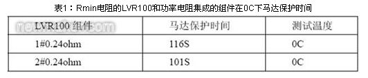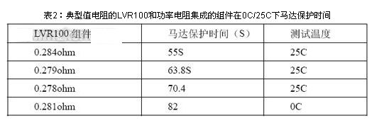 選取兩片Rmin電阻0.22ohm 的LVR100和功率電阻集成的組件,下面表1為馬達(dá)的保護(hù)時(shí)間。