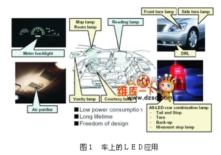 LED已經(jīng)廣泛的應(yīng)用于車內(nèi)的相關(guān)照明或指示用光源,由圖1可知,從車內(nèi)的儀表板燈、車頂燈、化妝燈、迎賓燈等,到車外的尾燈、前后轉(zhuǎn)向燈、倒車燈、第三剎車燈等都可見(jiàn)到LED的相關(guān)應(yīng)用。