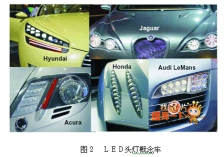 從LED的應(yīng)用歷史來(lái)看,早在1992年時(shí)已經(jīng)有LED應(yīng)用于第三剎車燈上的先例;而在2000年時(shí)則進(jìn)一步的應(yīng)用于尾燈、轉(zhuǎn)向燈與剎車燈;到了2002年Audi?。粒嘎氏葘ⅲ蹋牛墓庠粗糜谇爸脽艟邇?nèi)作為日行燈,開(kāi)啟了設(shè)計(jì)師與工程師們?cè)谇爸脽艟叩南胂罂臻g。在之后的許多國(guó)際車展上都可以看到LED作為前照燈源的概念車,如圖2所示。