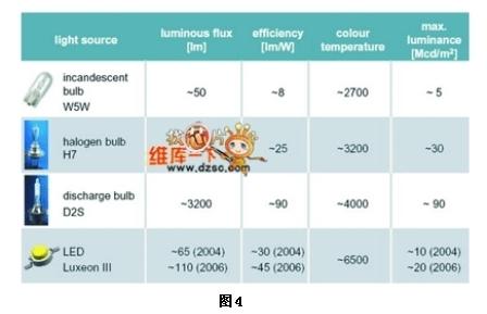 目前使用于車上的燈源可區(qū)分為白熾燈泡、鹵素?zé)襞?、氣體放電式燈泡與LED光源,其比較如圖4所示。