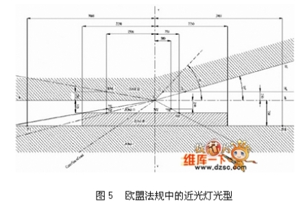 光學(xué)設(shè)計(jì)時(shí)先考慮法規(guī)需求,討論視角與強(qiáng)度關(guān)系,以近燈為例須針對(duì)其特殊的15度揚(yáng)角設(shè)計(jì),如圖5所示。在傳統(tǒng)的燈具設(shè)計(jì)上由先期的利用反射罩配合透鏡刻紋作角度與強(qiáng)度的控制,演變成為利用反射罩直接控制強(qiáng)度角度,也發(fā)展出利用成像方式的魚(yú)眼透鏡設(shè)計(jì)法。不論何種的設(shè)計(jì)方式都須先考慮選用光源的特性,特別是角度與強(qiáng)度的光型輸出(Beam pattern),對(duì)傳統(tǒng)的光源而言,大多為柱狀光源,可產(chǎn)生類似蝴蝶外型的光型輸出,進(jìn)而發(fā)展出來(lái)與之搭配的透鏡、反射罩、擋板、透鏡等光學(xué)組件。而利用LED作為光源設(shè)計(jì)燈具時(shí),需重新考慮其光學(xué)特性由傳統(tǒng)的柱狀光源變?yōu)槠矫婀庠矗ú煌姆庋b設(shè)計(jì)有不同的光型輸出),進(jìn)而搭配外部的光學(xué)組件而產(chǎn)生不同組合以應(yīng)用于不同產(chǎn)品,依照德國(guó)車燈大廠HELLA的設(shè)計(jì)分類,可將光源分為八大類,如圖6 所示。LED目前的單位面積發(fā)光量尚不及鹵素?zé)襞菖c放電式燈泡,想得到相同的流明輸出,LED需要較大的封裝面積。隨著光源輸出面積的增加,光學(xué)設(shè)計(jì)的難度也隨之提升,所以在現(xiàn)有的概念車上,都以模塊化光學(xué)設(shè)計(jì)取代既有的單一燈室設(shè)計(jì),利用多組燈源達(dá)到傳統(tǒng)燈具的照明水平,除了降低光學(xué)設(shè)計(jì)的難度,也增加車體造型的設(shè)計(jì)感。