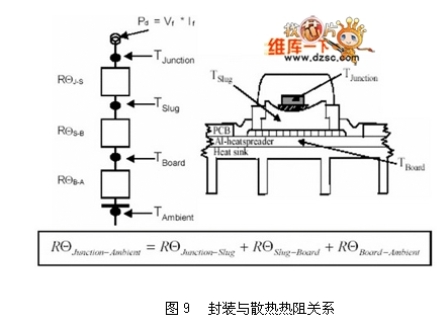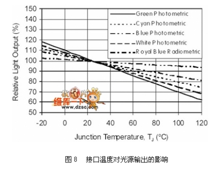 散熱設(shè)計(jì)是LED光源區(qū)別于傳統(tǒng)光源的課題之一。傳統(tǒng)燈具產(chǎn)生的熱遠(yuǎn)高于LED,但傳統(tǒng)燈具不會(huì)因?yàn)楦邷囟档推涔庠摧敵瞿芰?,但LED的光輸出卻會(huì)隨著本身接口(Junction,?。校谓涌冢囟鹊纳叨陆?,如圖8所示。而其產(chǎn)生的熱如何散除到外界環(huán)境與其封裝結(jié)構(gòu)材料息息相關(guān),牽涉到使用的散熱材料與相關(guān)外型,關(guān)系如圖9所示,其中熱阻的概念,代表輸入W功率時(shí),需要提高多少K溫度才足以散熱。以現(xiàn)有的封裝技術(shù)最高可允許LED操作在185℃(Lumiled K2),但一般因?yàn)榉庋b膠材的關(guān)系,可允許的操作溫度約在125℃,除了考慮光源輸出效率之外,亦考慮封裝膠材的變質(zhì)(樹(shù)脂類材料在高溫有老化現(xiàn)象)。
