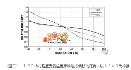 另一點(diǎn)相當(dāng)重要,同時(shí)必須注意的是,當(dāng)LED使用時(shí)間越久,光輸出強(qiáng)度就會(huì)降低,因此經(jīng)過(guò)一段時(shí)間后,RGB?。蹋牛南到y(tǒng)的最大可輸出亮度將會(huì)下降,雖然在大部分的應(yīng)用事實(shí)上都可以接受逐漸且穩(wěn)定的亮度衰減,但有時(shí)無(wú)法接受的是RGB發(fā)光系統(tǒng)色度的變化,ASSP擁有能夠穩(wěn)定控制RGB發(fā)光系統(tǒng)光度衰減的功能,例如維持色度的穩(wěn)定在一定的容忍度內(nèi),甚至當(dāng)最高可輸出亮度下降時(shí)。