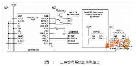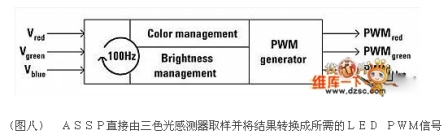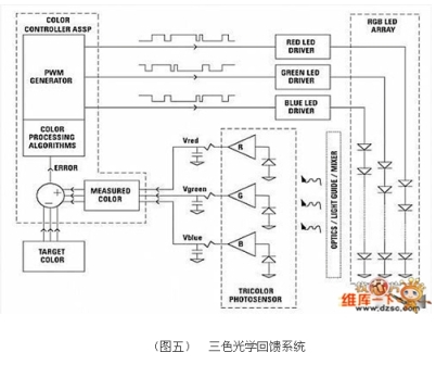 另一個(gè)更先進(jìn)的光學(xué)反饋方式則是采用三色光感測(cè)器,通常包含三個(gè)獨(dú)立的光感測(cè)器以及上方的三色濾鏡,讓這類(lèi)光感測(cè)器能夠記錄色彩資訊而不只是亮度,這將可以進(jìn)一步控制紅、綠與藍(lán)光LED的發(fā)光強(qiáng)度比,這個(gè)功能相當(dāng)關(guān)鍵,因?yàn)樗專(zhuān)遥牵鹿庠吹牧炼扰c色度得以控制,而ASSP則在三色光學(xué)反饋設(shè)計(jì)上扮演了重要的角色。