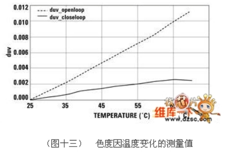 (圖十三)顯示了開(kāi)回路與閉回路RGB光源系統(tǒng)的效能差別,實(shí)驗(yàn)采9000K白色目標(biāo)色進(jìn)行并使用duv做為評(píng)比指標(biāo)。