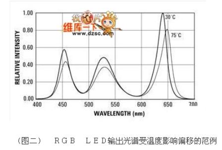 這類(lèi)LED光源的簡(jiǎn)單開(kāi)迴路架構(gòu)方式有個(gè)潛在的問(wèn)題,由于LED的光學(xué)特性會(huì)受到運(yùn)作條件的影響,因此組合后的RGB光源輸出的亮度以及色度都會(huì)變化。同時(shí),每顆LED元件也不盡相同,因此造成RGB光源的輸出產(chǎn)生更多變化,(圖二)與(圖三)就描述了幾個(gè)LED變動(dòng)的范例。