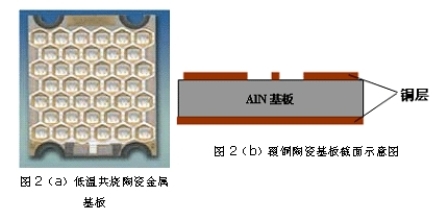 LED封裝熱阻主要包括材料(散熱基板和熱沉結(jié)構(gòu))內(nèi)部熱阻和界面熱阻。散熱基板的作用就是吸收芯片產(chǎn)生的熱量,并傳導(dǎo)到熱沉上,實(shí)現(xiàn)與外界的熱交換。常用的散熱基板材料包括硅、金屬(如鋁,銅)、陶瓷(如Al2O3,AlN,SiC)和復(fù)合材料等。如Nichia公司的第三代LED采用CuW做襯底,將1mm芯片倒裝在CuW襯底上,降低了封裝熱阻,提高了發(fā)光功率和效率;Lamina Ceramics公司則研制了低溫共燒陶瓷金屬基板,如圖2(a),并開發(fā)了相應(yīng)的LED封裝技術(shù)。該技術(shù)首先制備出適于共晶焊的大功率LED芯片和相應(yīng)的陶瓷基板,然后將LED芯片與基板直接焊接在一起。由于該基板上集成了共晶焊層、靜電保護(hù)電路、驅(qū)動電路及控制補(bǔ)償電路,不僅結(jié)構(gòu)簡單,而且由于材料熱導(dǎo)率高,熱界面少,大大提高了散熱性能,為大功率LED陣列封裝提出了解決方案。德國Curmilk公司研制的高導(dǎo)熱性覆銅陶瓷板,由陶瓷基板(AlN或Al2O3)和導(dǎo)電層(Cu)在高溫高壓下燒結(jié)而成,沒有使用黏結(jié)劑,因此導(dǎo)熱性能好、強(qiáng)度高、絕緣性強(qiáng),如圖2(b)所示。其中氮化鋁(AlN)的熱導(dǎo)率為160W/mk,熱膨脹系數(shù)為4.0×10-6/℃(與硅的熱膨脹系數(shù)3.2×10-6/℃相當(dāng)),從而降低了封裝熱應(yīng)力。