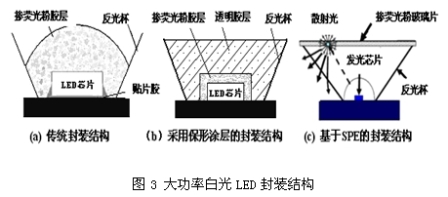 傳統(tǒng)的熒光粉涂敷方式是將熒光粉與灌封膠混合,然后點(diǎn)涂在芯片上。由于無法對熒光粉的涂敷厚度和形狀進(jìn)行精確控制,導(dǎo)致出射光色彩不一致,出現(xiàn)偏藍(lán)光或者偏黃光。而Lumileds公司開發(fā)的保形涂層(Conformal coating)技術(shù)可實(shí)現(xiàn)熒光粉的均勻涂覆,保障了光色的均勻性,如圖3(b)。但研究表明,當(dāng)熒光粉直接涂覆在芯片表面時,由于光散射的存在,出光效率較低。有鑒于此,美國Rensselaer 研究所提出了一種光子散射萃取工藝(Scattered Photon Extraction method,SPE),通過在芯片表面布置一個聚焦透鏡,并將含熒光粉的玻璃片置于距芯片一定位置,不僅提高了器件可靠性,而且大大提高了光效(60%),如圖3(c)。