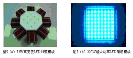 在系統(tǒng)集成方面,臺灣新強(qiáng)光電公司采用系統(tǒng)封裝技術(shù)(SiP), 并通過翅片+熱管的方式搭配高效能散熱模塊,研制出了72W、80W的高亮度白光LED光源,如圖5(a)。由于封裝熱阻較低(4.38℃/W),當(dāng)環(huán)境溫度為25℃時,LED結(jié)溫控制在60℃以下,從而確保了LED的使用壽命和良好的發(fā)光性能。而華中科技大學(xué)則采用COB封裝和微噴主動散熱技術(shù),封裝出了220W和1500W的超大功率LED白光光源,如圖5(b)。