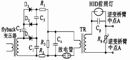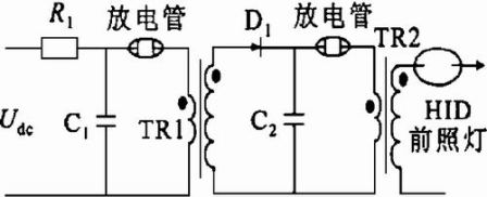 啟動期間,電子鎮(zhèn)流器要經(jīng)歷高壓擊穿、電流接續(xù)、預(yù)熱維弧3個階段。高壓啟動電路是HID 前照燈能否瞬間點(diǎn)亮的基礎(chǔ)。但輝光放電后慣性和濾波延遲使直流變換器和檢測回路很難有較快的響應(yīng)速度,所以需要如圖1所示的電流接續(xù)(take-over) 電路,它可利用電容預(yù)先儲存的能量為燈提供一個較大的瞬間電流(約300ms) ,保證輝弧可靠過渡。一般高壓發(fā)生電路有以下幾種:
