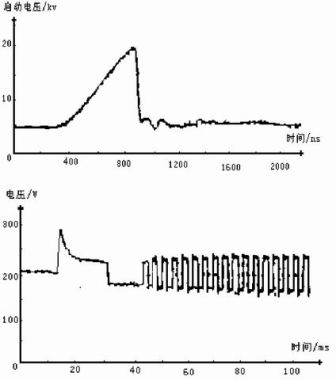 圖5采用3倍壓整流電路,放電管的額定擊穿電壓為600V ,高壓包的匝數(shù)比1∶50 ,放電管擊穿電壓為600V。實驗波形見圖6。