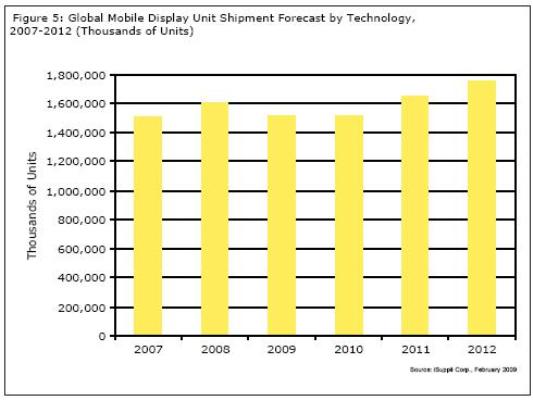 圖5所示為iSuppli公司對于2007-2012年手機顯示器市場的預測。