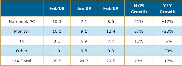 DisplaySearch上海辦公室,2009年3月23日 --- 根據(jù)DisplaySearchy最新關(guān)于全球TFT LCD出貨調(diào)查指出,二月份大尺寸面板出貨量為2千950萬片,較上月大幅成長(zhǎng)23%,營(yíng)收直逼29.5億美元,較上月成長(zhǎng)14%,這是自2008年九月份以來首次見到成長(zhǎng)的月份。二月份的良好表現(xiàn)主要來自于急單效應(yīng)與客戶持續(xù)補(bǔ)充庫(kù)存,也是TFT LCD產(chǎn)業(yè)即將觸底反彈的信號(hào)。