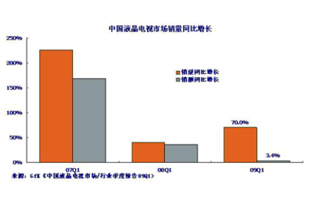 GfK中國發(fā)布的《液晶電視產(chǎn)業(yè)市場季度報告(09Q1)》顯示:2009年1季度,中國液晶電視市場出現(xiàn)了反彈,銷量達(dá)到476萬臺,比2008年1季度增長了約70%。