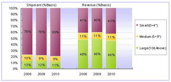 再從出貨尺寸別來看,主要觸控面板的出貨尺寸集中在4寸以下(含4寸),2008年出貨量為3億6,000萬片,占整體市場比重將近79%。同樣地,受到全球經濟衰退的影響,2009年在4寸以下(含4寸)的出貨量雖然目前看來將維持與2008年相仿的水準,但到了2010年預計將會有2%的成長幅度。