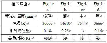我們曾對此進行了實驗研究,我們利用某公司生產(chǎn)的1W高亮度藍光LED,其光譜的中心輻射波長為470nm見Fig.3,去除外封裝后分別涂敷不同厚度的輻射的中心波長為560nm的黃光熒光粉涂層,經(jīng)處理后測量其發(fā)射光譜。從二十余種不同厚度的樣品中選擇了四種典型情況,其結(jié)果見Fig