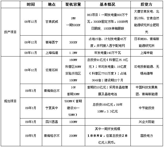 受國家政策的導(dǎo)向,從2008年底到2009年上半年,全國上馬了多個大型并網(wǎng)電站項(xiàng)目,如青海柴達(dá)木的1GW光伏電站項(xiàng)目、青海格爾木的 200MW光伏電站項(xiàng)目、寧夏吳中的500MW光伏電站項(xiàng)目等,盡管目前國家只批準(zhǔn)了三個光伏電站項(xiàng)目包括上海崇明島1MW項(xiàng)目、255千瓦的內(nèi)蒙古鄂爾多斯項(xiàng)目和甘肅敦煌的100MW項(xiàng)目,而以上新上馬的項(xiàng)目還有待國家的批復(fù)。