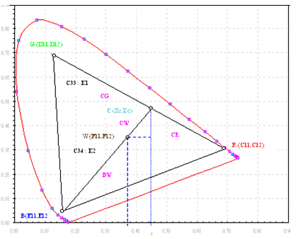 2. 尋找R、G兩種顏色配色后的座標(biāo)(已知R、G、B、W四點(diǎn)座標(biāo)計(jì)算BW直線的延長(zhǎng)線的交點(diǎn)可得出C點(diǎn)座標(biāo)。
