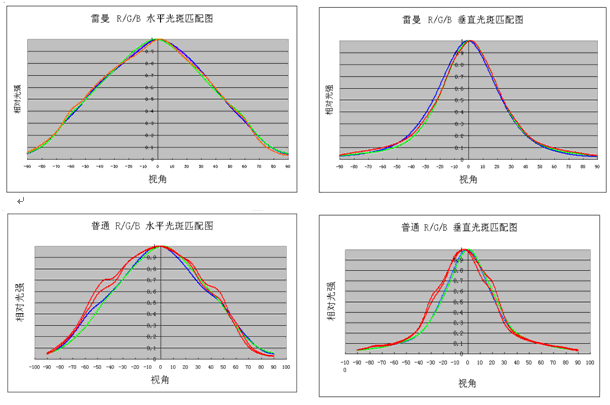 前兩幅圖是雷曼光電自行研制產(chǎn)品的配光效果,后兩幅是以前用公模的產(chǎn)品的配光效果,從圖中可以看出,原來公模的產(chǎn)品在50度角度左右可能會(huì)偏紅,要調(diào)整到比較理想的效果比較困難。雷曼光電自行研制的產(chǎn)品考慮到了客戶的這種需求,在左右90度的三種顏色的配光都較為理想,這就為顯示屏的白平衡調(diào)節(jié)提供了強(qiáng)有力的支持。