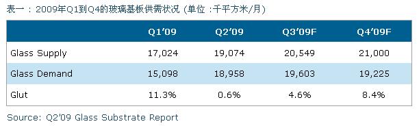 由此份報告中計算出玻璃基板的供需狀況(如下表),玻璃基板在2009年第二季每個月平均需求預(yù)估超過1千890萬平方米,較2009年 Q1成長26%,而玻璃基板的供應(yīng)狀況從第一季到第二季僅成長12%,供應(yīng)端成長的速度遠遠趕不及需求的快速成長。
