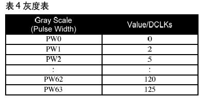 全彩顯示對(duì)每一個(gè)RGB原色分量提供6-bit,即64級(jí)灰度,通過(guò)電流驅(qū)動(dòng)階段列驅(qū)動(dòng)的脈寬調(diào)制(PWM)設(shè)置不同的灰度級(jí)。灰度表即為存儲(chǔ)了對(duì)應(yīng)64級(jí)灰度(GS0~GS63)的PWM(PW0~PW63)的值。脈寬越寬,象素顯示越亮。因此,每個(gè)象素的顯示亮度由灰度表中的脈寬值決定。