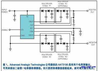 AdvancedAnalogicTechnologies公司的副總裁JanNilsson評(píng)述道:“許多手機(jī)、數(shù)碼相機(jī)及其它便攜式設(shè)備中的有源矩陣LCD和OLED……子系統(tǒng)要求正負(fù)兩種小電流偏置電源。”這種情況使得電源前景復(fù)雜化。AdvancedAnalogicTechnologies公司推出的AAT3190能滿(mǎn)足這種需求,因?yàn)樗柚粔K采用自同步雙電荷泵體系結(jié)構(gòu)其工作于標(biāo)稱(chēng)1MHz的開(kāi)關(guān)頻率芯片來(lái)生成正負(fù)兩種電源(圖1)。這種電荷泵可利用2.7V~5.5V的單極性輸入電源產(chǎn)生最大可達(dá)±25V的可調(diào)輸出電壓。