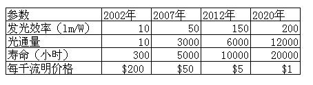 固態(tài)光源OLED目前正處在長期研發(fā)中,美國的技術(shù)進(jìn)程詳情可見下表