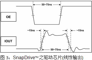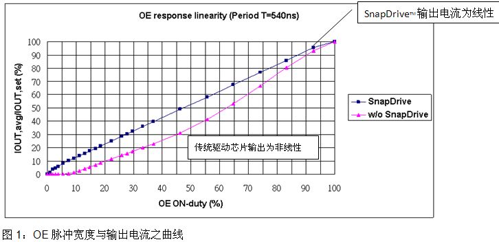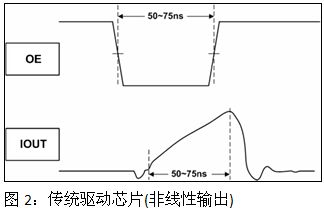 以下為臺(tái)灣迅杰科技推出包含SnapDriveTM技術(shù)之驅(qū)動(dòng)芯片測試條件及結(jié)果,藉圖1及圖3可以明顯看出其驅(qū)動(dòng)芯片在極小的OE脈沖寬度下其輸出電流仍為線性輸出,而傳統(tǒng)驅(qū)動(dòng)芯片則無法提供線性的輸出。