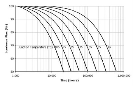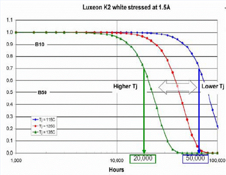 當(dāng)結(jié)溫從115℃提高到135℃,就會使壽命從50,000小時降低到20,000小時。其他各家公司的光衰曲線應(yīng)當(dāng)可以向原廠索取。