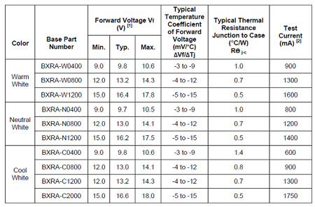 假定對LED以Io恒流供電,在結(jié)溫為T1時,電壓為V1,而當(dāng)結(jié)溫升高為T2時,整個伏安特性左移,電流Io不變,電壓變?yōu)閂2。這兩個電壓差被溫度去除,就可以得到其溫度系數(shù),以mV/oC表示。對于普通硅二極管,這個溫度系數(shù)大約為-2mV/oC。但是LED大多數(shù)不是用硅材料制成的,所以它的溫度系數(shù)也要另外去測定。幸好各家LED廠家的數(shù)據(jù)表中大多給出了它的溫度系數(shù)。例如對于Cree公司的XLamp7090XR-E大功率LED,其溫度系數(shù)為-4mV/oC。要比普通硅二極管大2倍。至于美國普瑞的陣列LED(BXRA)就給出了更為詳細的數(shù)據(jù)。