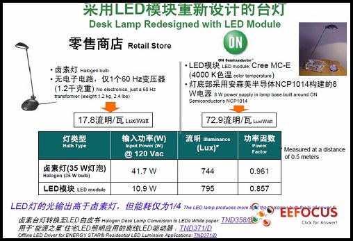 在現(xiàn)場,Laurent Jenck 展示了兩款從零售商店購得的鹵素臺(tái)燈(采用35 W燈泡)。一款采用原鹵素?zé)簦硗庖豢顒t采用了安森美NCP1014芯片進(jìn)行穩(wěn)壓改進(jìn)。原鹵素?zé)粼?20 Vac條件下的輸入功率為41.7 W,在0.5米距離處測得的光亮度為744流明。采用了自供電單片式開關(guān)穩(wěn)壓器的臺(tái)燈在120 Vac條件下輸入功率為10.9 W,即能耗僅相當(dāng)于鹵素?zé)舻?/4;同時(shí),這LED臺(tái)燈在同等距離條件下測得的光亮度為795流明,更優(yōu)于鹵素?zé)?,?2.9流明/瓦(lm/W)的能效(efficacy)更是數(shù)倍于鹵素?zé)?17.8 lm/W)。
