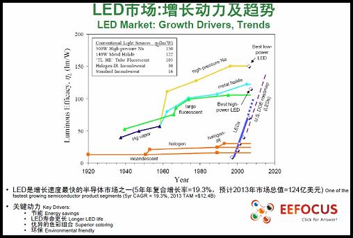 與傳統(tǒng)光源相比,LED具有極高的光效。Laurent Jenck 介紹,普通白熾燈的光效為 10 lm/W,鹵素?zé)舻墓庑Ъs為 20 lm/W,而今天LED元件光效已經(jīng)達(dá)到80lm-100lm/w,未來還將提升到150lm/w。此外,LED還具備使用壽命長、容易開關(guān)、無汞和設(shè)計(jì) 自由度高等特點(diǎn)。“隨著LED技術(shù)的持續(xù)進(jìn)步,未來3~5年,LED現(xiàn)有的1億美元左右市場規(guī)模還將擴(kuò)大10倍以上,而且就背光液晶電視領(lǐng)域來說,3年后 的市場份額將達(dá)到50%。”