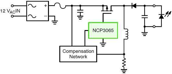 這參考設(shè)計(jì)的一項(xiàng)關(guān)鍵考慮因素,是在12 Vac輸入條件下,跨輸入線路變化及輸出電壓變化,實(shí)現(xiàn)平坦的電流穩(wěn)流。這參考設(shè)計(jì)電路基于安森美半導(dǎo)體的NCP3065構(gòu)建,工作頻率約為150 kHz,采用非隔離型配置。NCP3065是一款單片開關(guān)穩(wěn)壓器,支持12 Vdc或12 Vac電源輸入,設(shè)計(jì)用于為HB-LED提供恒定電流。除了NCP3065,這參考設(shè)計(jì)還結(jié)合了自動(dòng)檢測電路。這參考設(shè)計(jì)的功能框圖如圖1所示。