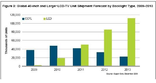 圖 3 所示為iSuppli 公司對(duì)40 英寸和更大尺寸液晶電視背光的單位出貨量預(yù)測(cè),按背光類型細(xì)分,包括CCFL 和LED,涵蓋2009 到2013 年。