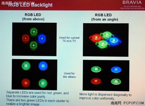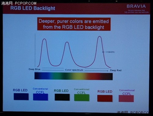 此外,RGB-LED在光譜特性上也大幅優(yōu)于CCFL。RGB三種LED發(fā)出的三原色光非常純正,能量高度集中.這點(diǎn)在最后的色域范圍方面體現(xiàn)的最為明顯。據(jù)工程師介紹,采用了“動(dòng)態(tài)麗彩LED背光源”的BRAVIA在實(shí)驗(yàn)室中測(cè)得的色域范圍已經(jīng)接近普通液晶的2倍,達(dá)到了一個(gè)前所未有的新高度。因此,的旗艦BRAVIA也實(shí)現(xiàn)了對(duì)最新廣色域標(biāo)準(zhǔn)x.v.Color的支持,如果配合使用支持x.v.Color色域的攝像機(jī)使用,消費(fèi)者將看到非常逼真自然的色彩和畫(huà)面。