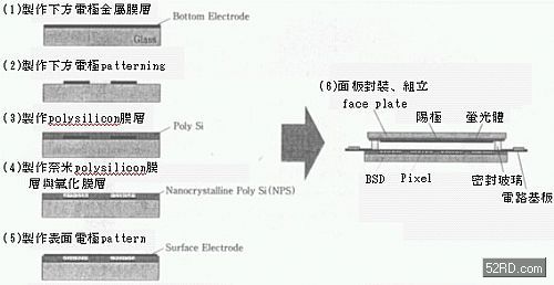 表3是負極基板的制作流程,表中左側(cè)是利用BSD試作FED的制程條件,右側(cè)是未來商品化時的預(yù)定制造方法。